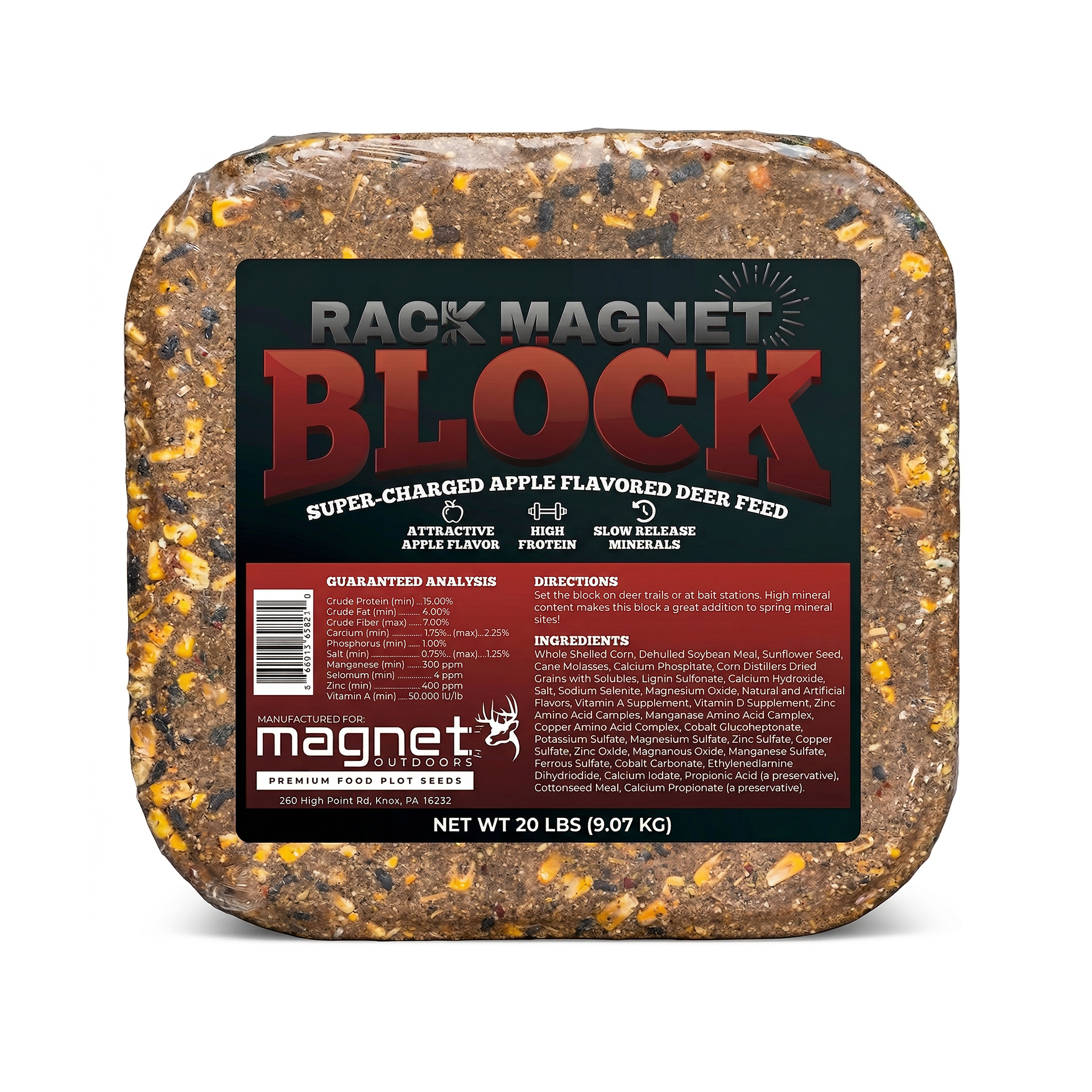 The Magnet Outdoors Rack Magnet Deer Block is a heavy-duty, 20 pound pressed block engineered to provide long-lasting attraction and essential nutrition. Packed with 15 percent protein, this block supports overall herd health while helping bucks reach their full antler potential and does maintain body condition year round.